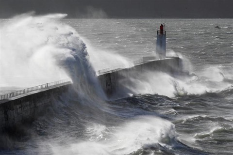 | Une vague se brise contre un phare à Saint-Malo, le 27 décembre 2017 en France. |