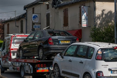 | Une remorqueuse emporte des voitures endommagées par les grêlons à Saint-Sornin, en Charente, le 5 juillet. |