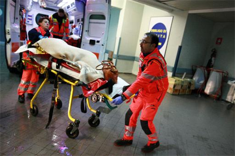 | Un passager secouru du Norman Atlantic arrive à l’hôpital Antonio Perrino, à Brindisi dans le Sud de l’Italie, le 28 décembre. |