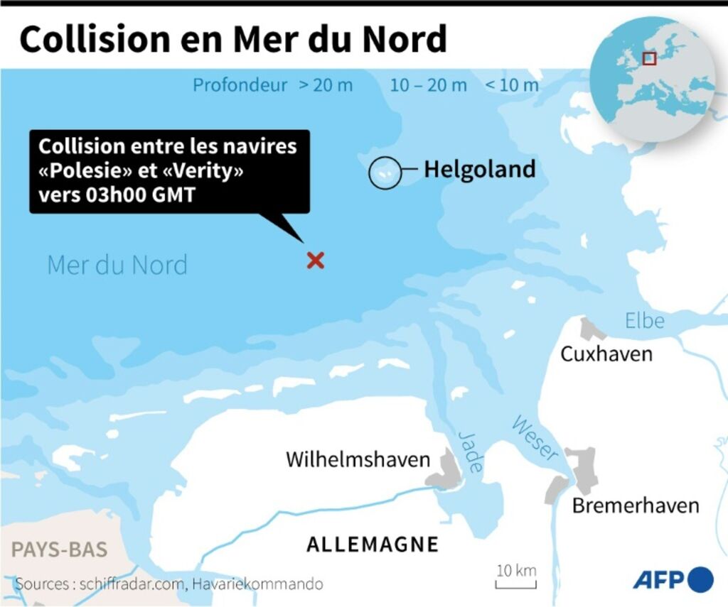 L'accident, dont les causes restent pour le moment inconnues, s'est produit vers 05h00 (03h00 GMT), à 22 km au sud-ouest de l'île allemande de Helgoland.