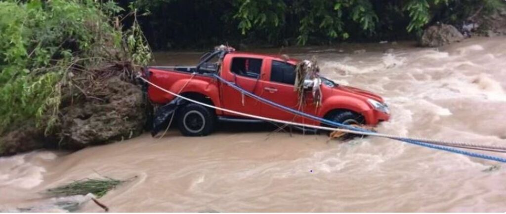 | La camionnette a traversé la route inondée et s'est retrouvée dans un ruisseau gonflé au bord de la route. |