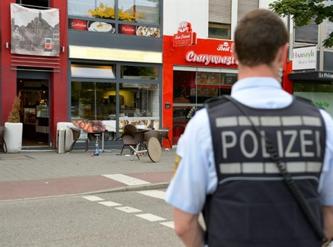 | Un policier sur les lieux d'une attaque mortelle à la machette, le 24 juillet à Reutlingen (Allemagne). |