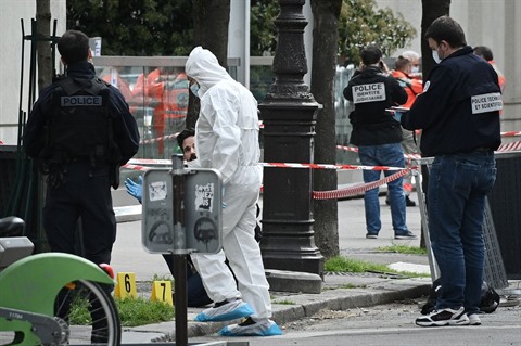 | Des enquêteurs relèvent des indices près de l'hôpital Henry Dunant où une personne a été tuée et une autre blessée par balles, le 12 avril à Paris. |