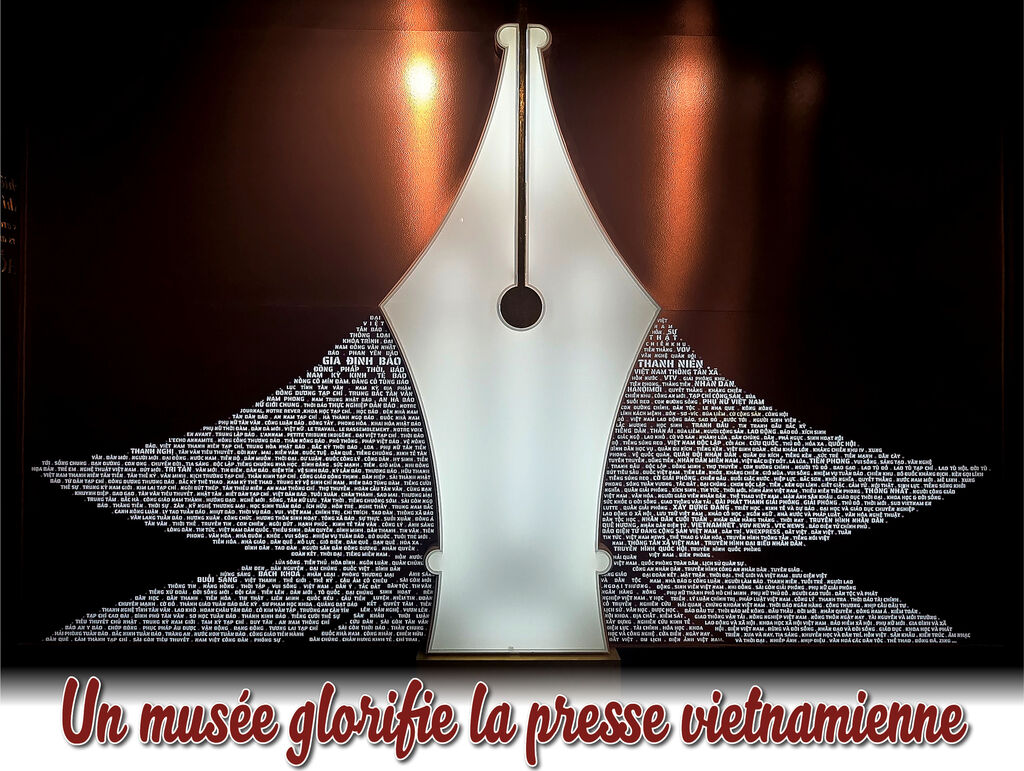 Le musée est organisé en deux sections d’exposition, sur deux étages. Le rez-de-chaussée abrite un hall et quatre espaces dédiés. Une œuvre symbolique représentant une lotus, avec une plume en son centre, occupe le centre du hall. “Sur les pétales de lotus sont inscrits les noms des organes de presse créés depuis la naissance du premier journal vietnamien. Une image forte, symbole de l’engagement des journalistes vietnamiens à conserver une plume éclairée et perspicace”, informe Thu Hiên, guide du musée.