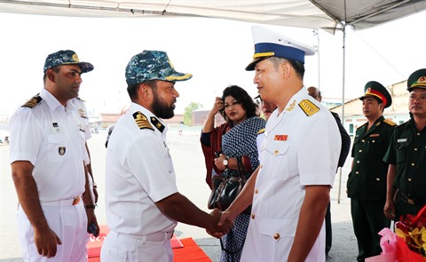 | Le capitaine de l’escorteur BNS PROTTOY, Mirza Mohammad Mehedi Hassan (gauche), et le capitaine Mai Biên Thuy, le 8 avril à Hô Chi Minh-Ville. |