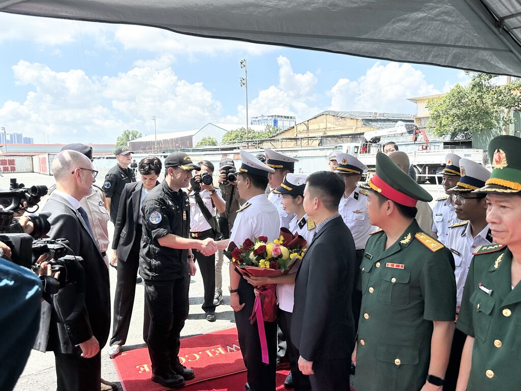 | Travis Bain, commandant du NCSM Montréal, et Shawn Steil, ambassadeur du Canada au Vietnam, accueillis par la Marine vietnamienne. |