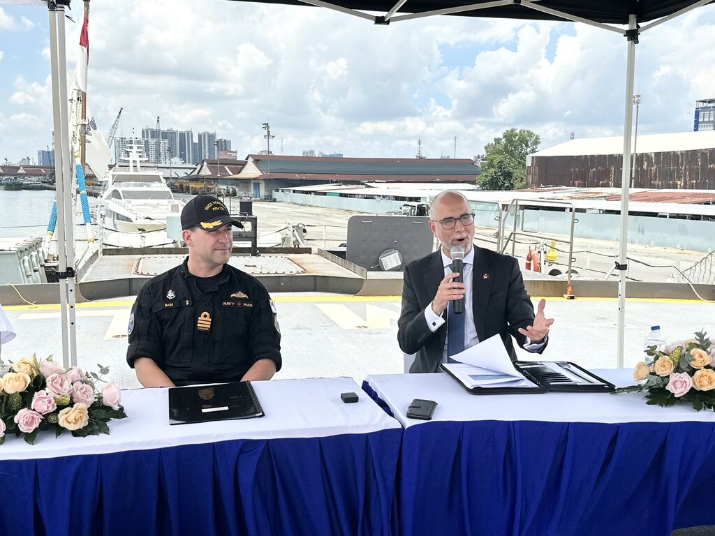 | Travis Bain, commandant du NCSM Montréal, et Shawn Steil, ambassadeur du Canada au Vietnam, répondent aux questions des journalistes lors d’un point presse suite à la visite du navire. |