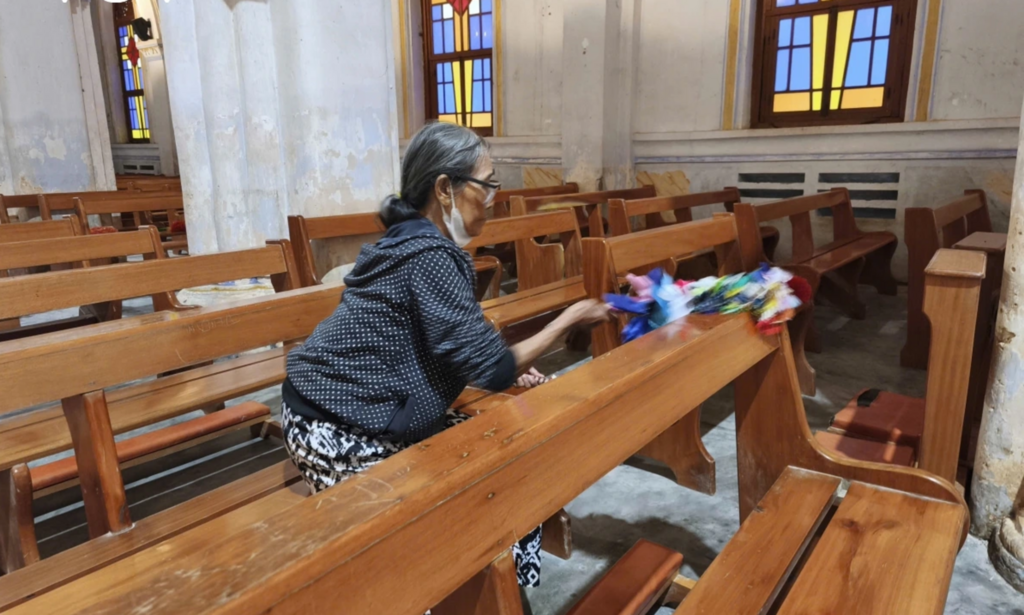 | Les femmes nettoient l’intérieur de l’église de Mang Lang avant les célébrations. |