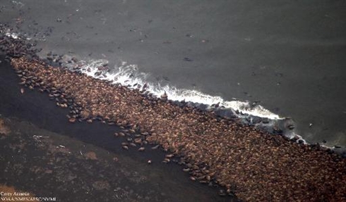Lors d'une surveillance aérienne le 27 septembre, les scientifiques de l'USGS, l'agence américaine de recherche sur l'environnement, a repéré ce vaste banc de morses échoués, évalué à environ 35.000.