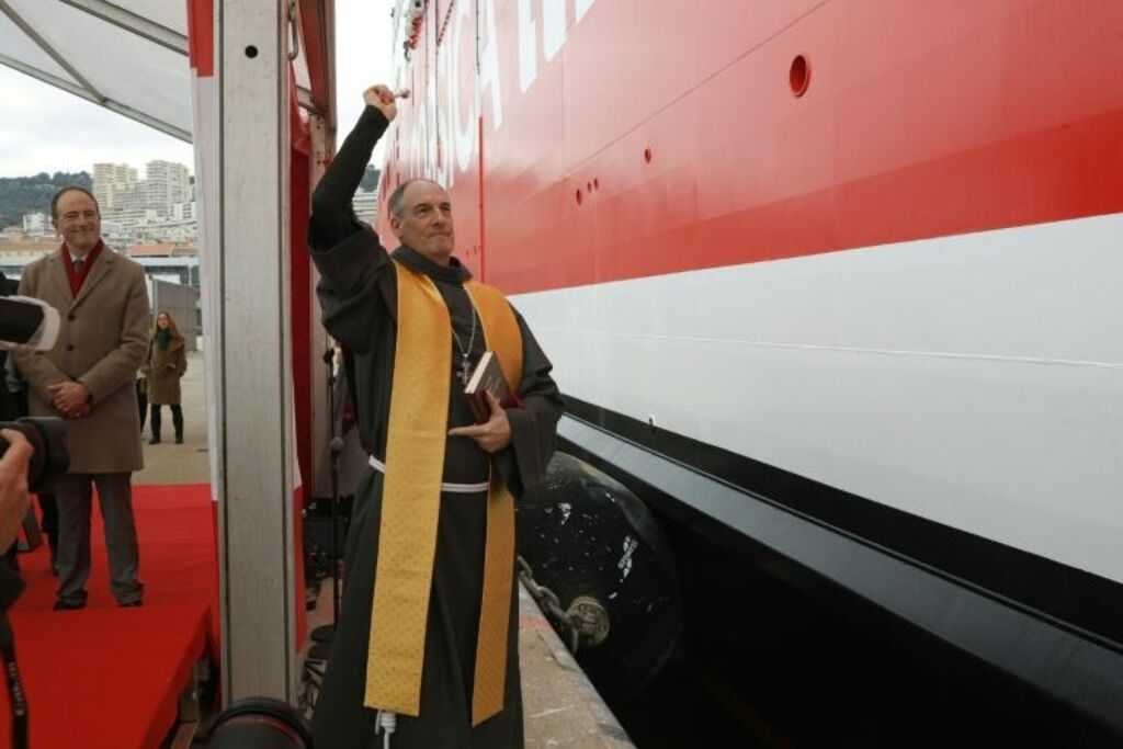 | L'archevêque d'Ajaccio Francois Xavier Bustillo procède à la bénédiction du navire A Galeotta, lors de son inauguration le 5 janvier à Ajaccio. |
