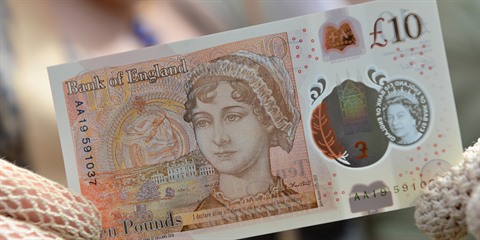 | Le nouveau billet de 10 livres à l’effigie de Jane Austen est présenté à Winchester, dans le Sud de l’Angleterre, le 18 juillet. |