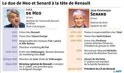 | Les parcours de Jean-Dominique Senard et Luca de Meo, duo à la tête du groupe automobile français Renault. |