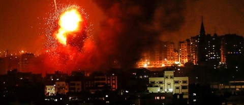 | Une explosion dans la ville palestinienne de Gaza après un raid aérien de l'armée israélienne, le 25 mars au soir. |