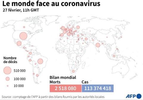 La pandémie a fait plus de 2,5 millions de morts dans le monde depuis décembre 2019, selon un bilan établi par l'AFP samedi 27 février. Plus de 113.374.410 cas d'infection ont été diagnostiqués.