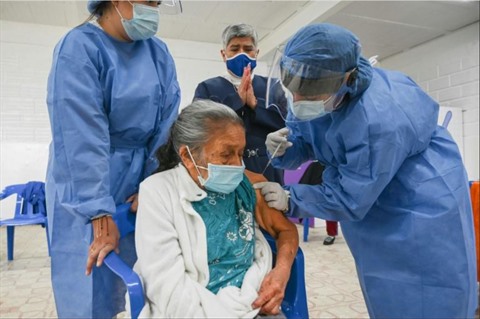 | Une personne âgée reçoit une dose du vaccin Sinovac dans une maison de santé à Medellin en Colombie, le 27 février 2021. |