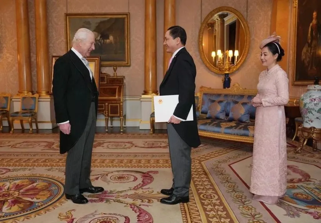 | L'ambassadeur du Vietnam au Royaume-Uni, Dô Minh Hùng (droite), présente ses lettres de créance au roi Charles III. |