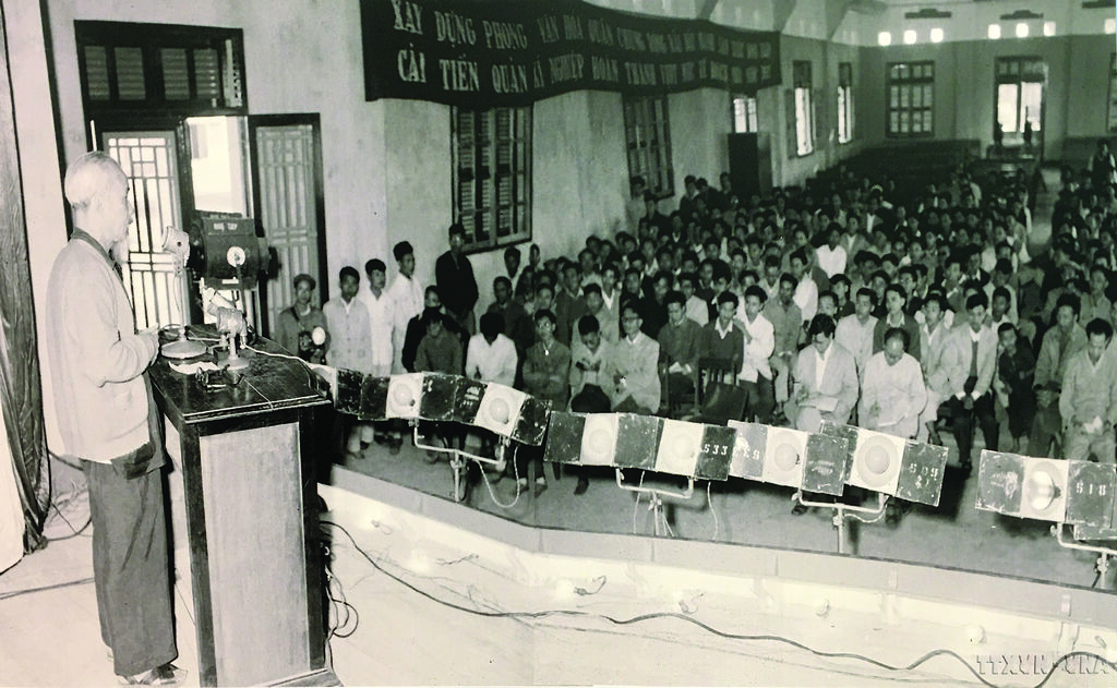 | L’Oncle Hô participe à une conférence-bilan du secteur de la culture en 1958. |