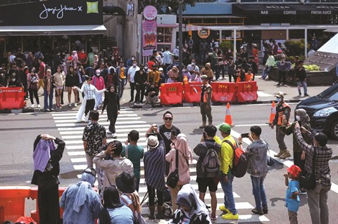 | Défilé de mode sur un passage piéton, à Jakarta (Indonésie). |