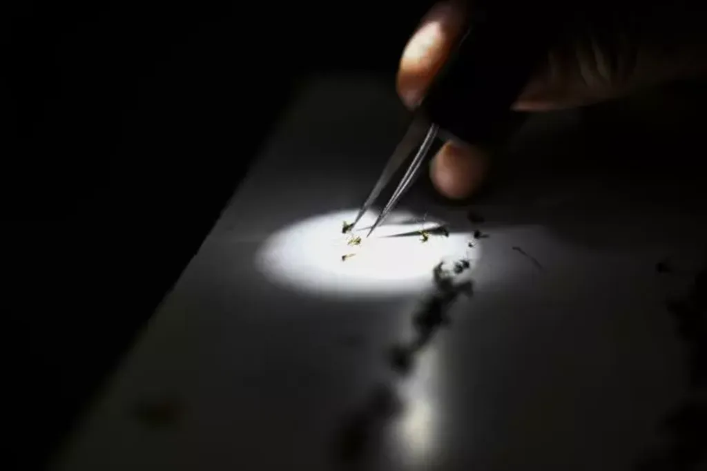 | Un spéciment de moustique est étudié dans les services de gestion des moustiques du comté de Sarasota, en Floride, le 30 juin 2023. |