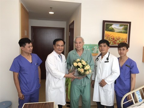 | Le Professeur Bùi Duc Phu (2e à gauche), directeur de l’Hôpital international Vinmec Times City, a offert des fleurs à M. Ngu lors de sa sortie de l'hôpital. |