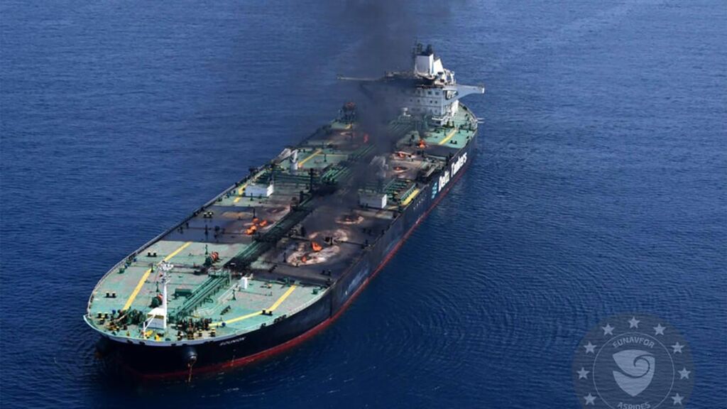 Le Sounion, qui transporte 150.000 tonnes de pétrole brut, a pris feu et perdu sa force motrice après avoir été attaqué le 21 août. Ses 25 membres d'équipages ont été évacués le lendemain par une frégate française de la mission européenne Aspides, déployée dans la zone.