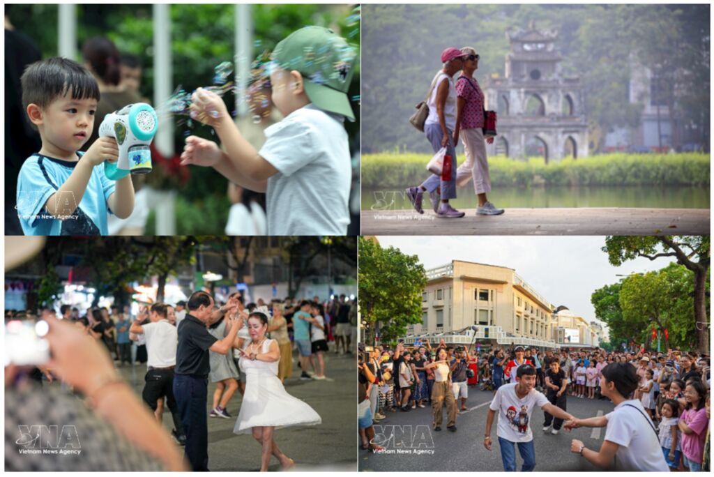 | La zone piétonne autour du lac Hoàn Kiêm accueille fréquemment des activités culturelles, contribuant à la richesse du tissu urbain d’Hanoï. |