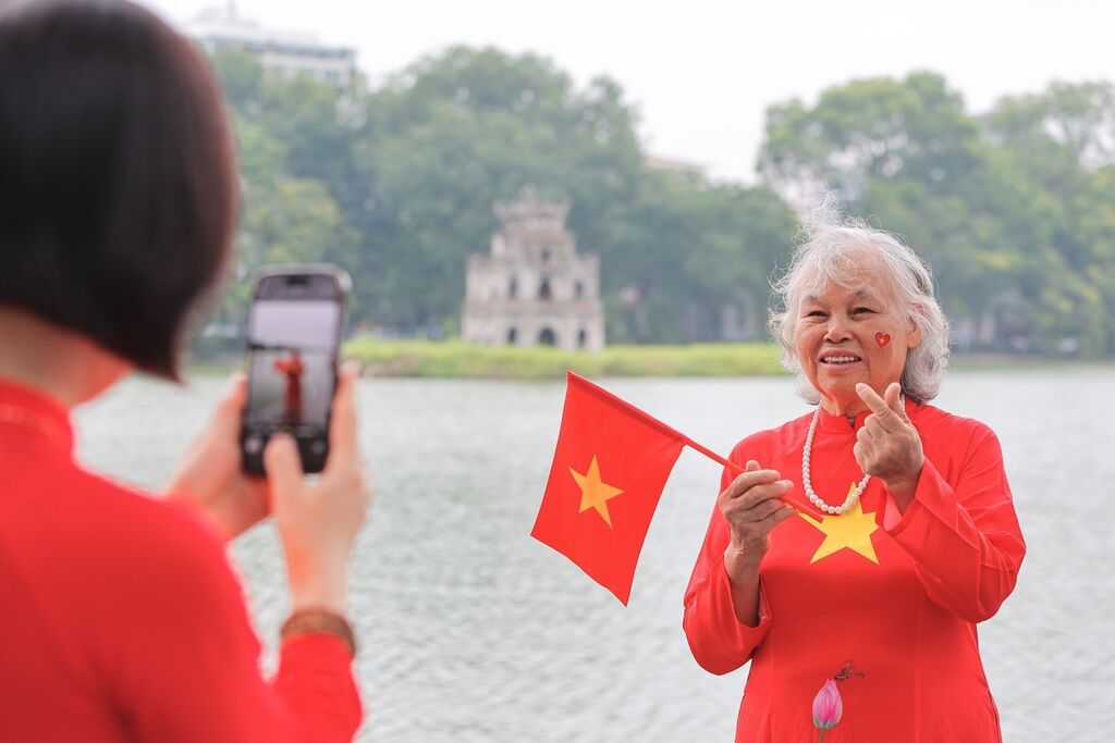 | Les personnes âgées se joignent à l’ambiance festive et immortalisent des instants mémorables au bord du lac Hoàn Kiêm (Hanoï). |
