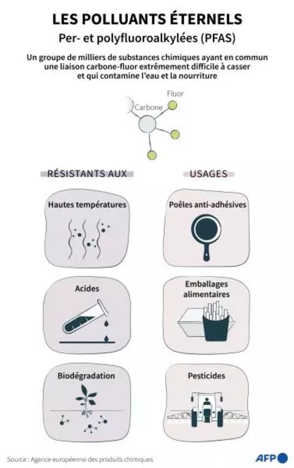 Quasi indestructibles, ces "polluants éternels" regroupent plus de 4.700 molécules et s'accumulent avec le temps dans l'air, le sol, les rivières, jusque dans le corps humain. En cas d'exposition sur une longue période, ils peuvent avoir des effets sur la fertilité ou favoriser certains cancers, d'après de premières études.