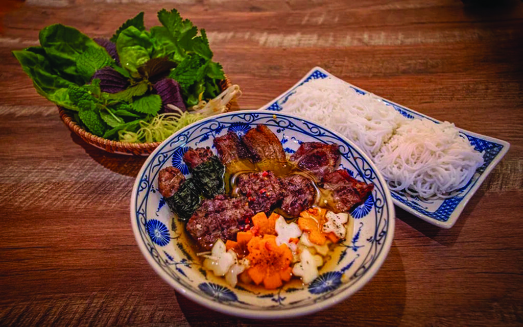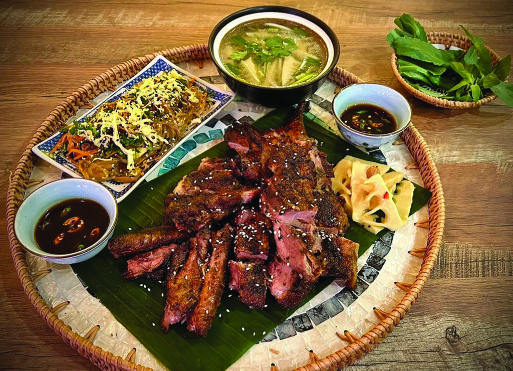 Le bun cha y est préparé avec une viande grillée au charbon comme à Hanoï. La soupe de nouilles au bœuf de Nam Dinh séduit par son bouillon profond, subtile-ment marqué par le nuoc mam (saumure de poisson). Quant au canard grillé de Vân Dinh, il est servi sur plateau, accompagné de pousses de bambou vinaigrées, d’une sauce soja à l’ail et au piment, et d’un bol de soupe au bambou et au sang, exactement comme au pays.