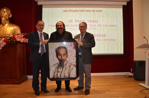 | L'artiste Mustapha Boutadjine (centre) a remis le tableau du Président Hô Chi Minh à l'ambassadeur du Vietnam en France, Nguyên Ngoc Son (gauche). |