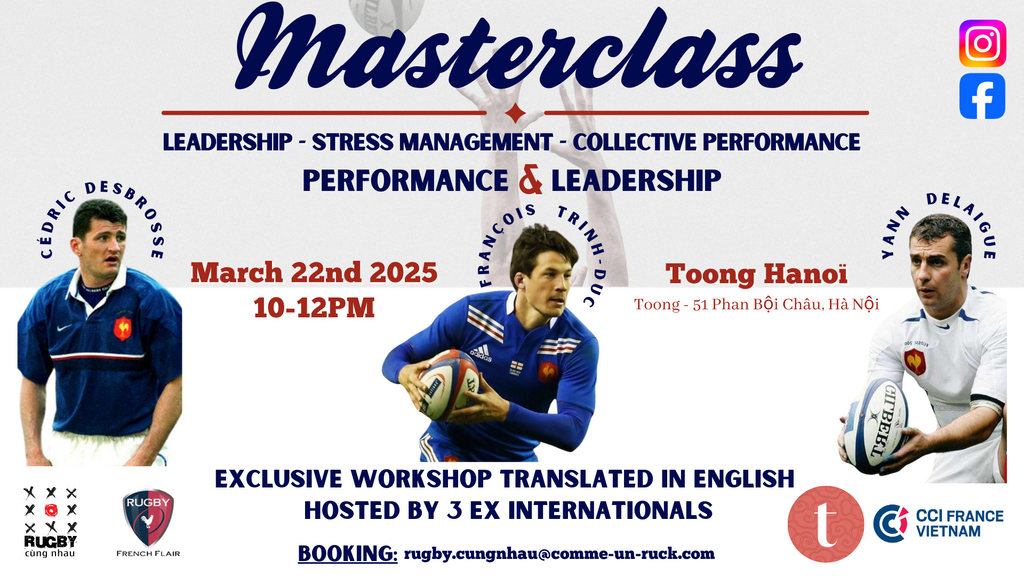 | L'affiche d'une masterclass sur rugby à Hanoï avec 3 anciens internationaux du XV de France. |