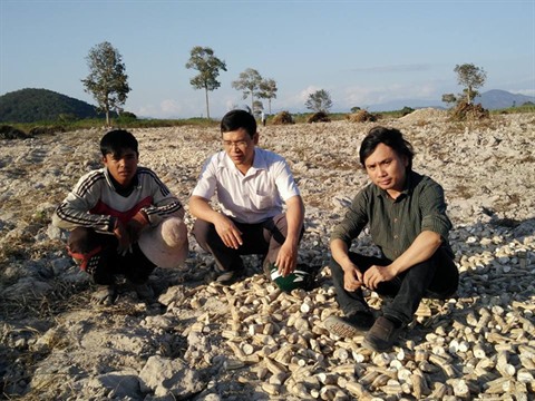 | Le directeur du lycée Dinh Tiên Hoàng, Trân Van Thê (centre), le professeur Ninh Van Dâu (droite) et leur élève Ksor Gôl. |