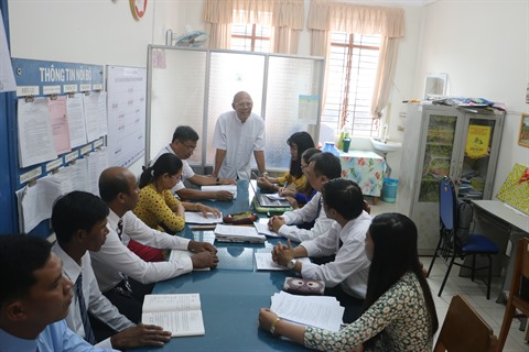 | Le professeur Lâm Es et des enseignants du lycée Pali, le 2 octobre à Soc Trang. |