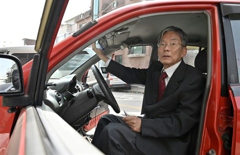 | L'ancien professeur sud-coréen Han Min-hong dans sa voiture autonome mise au point dans les années 1990, ici devant son entreprise à Yongin, au sud de Séoul, le 29 mars |