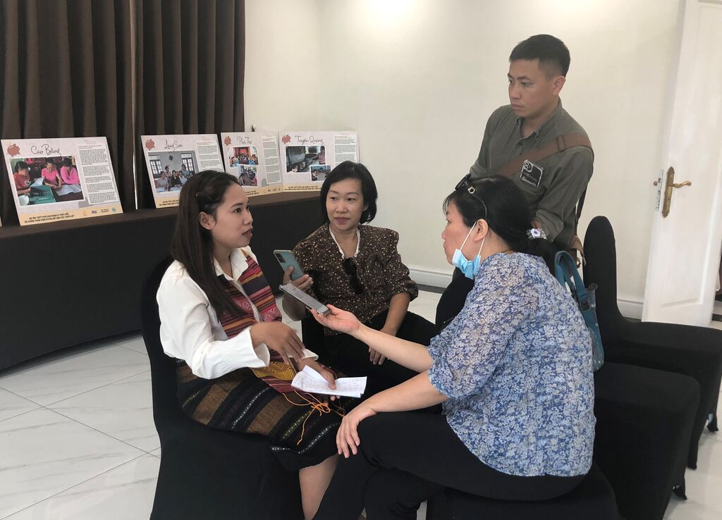| Les journalistes interviewent Hô Thi Nho, de l’ethnie Vân Kiêu, responsable d'un groupe VSLA, dans le hameau de Pa Hy, commune de Tà Long, district de Dakrông, province centrale de Quang Tri. |