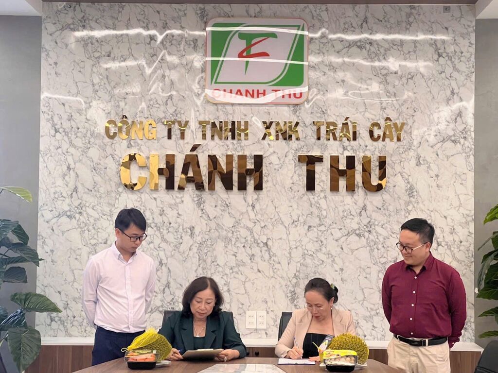 | Les représentantes de MENAS et de la société d'import-export de fruits Chanh Thu, située dans le district de Cho Lach, province de Bên Tre, signent un accord de coopération. |