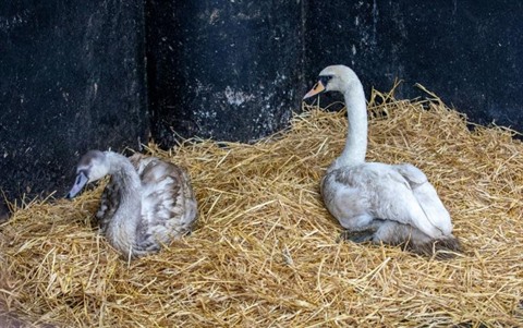 | Des cygnes blessés sont pris en charge dans les locaux d'un pub irlandais fermé pour cause de covid, le 18 février 2021 près de Navan (Ilade). |