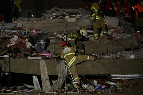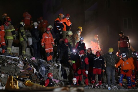 | Des secouristes sur les ruines d'un immeuble à Izmir, le 31 octobre 2020. |
