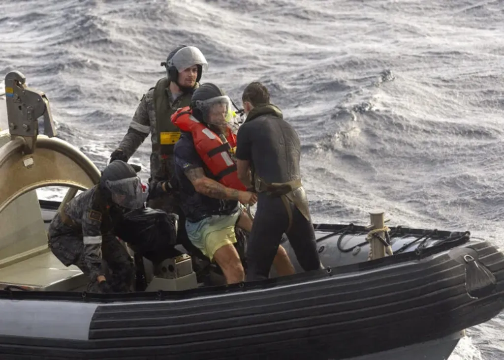| Un navire de la Marine australienne a récupéré sain et sauf le rameur, Aurimas Mockus (2e, droite), dans la mer de Corail (Australie). |