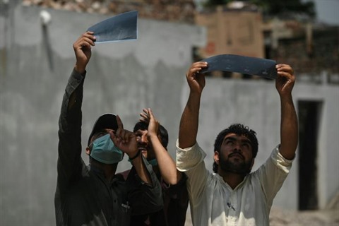 | Des curieux observent à travers des films radiologiques une éclipse annulaire, pendant laquelle la Lune cache partiellement le Soleil, le 21 juin à Islamabad, la capitale du Pakistan. |