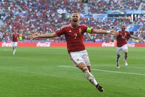 | La joie du Hongrois Balazs Dzsudzsak après un but contre le Portugal à l'Euro, le 22 juin à Lyon |