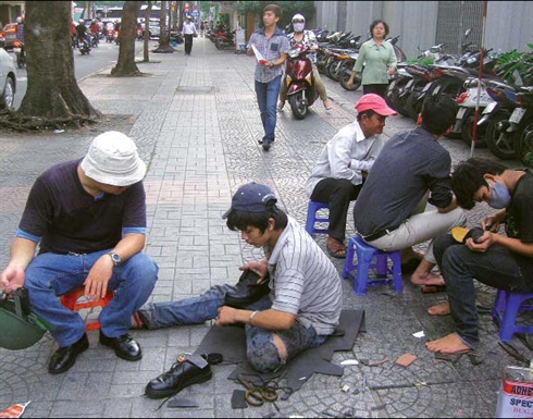 Hormis les clients habituels, le «magasin» de Nguyên Huu Van accueille aussi les clients de passage, souvent surpris de voir de nombreux clients en tenue hors de prix, soit en scooter, soit dans des voitures de grandes marques, confiant leurs chaussures aux mains habiles de Nguyên Huu Van. La boutique accueille également des étrangers qui, via un «bonjour» ou un «hello», saluent le propriétaire au visage barbouillé et aux mains souillées de colle. Tous sont des clients réguliers. Parfois, on voit aussi des conducteurs de bus des provinces environnantes de Hô Chi Minh Ville.
