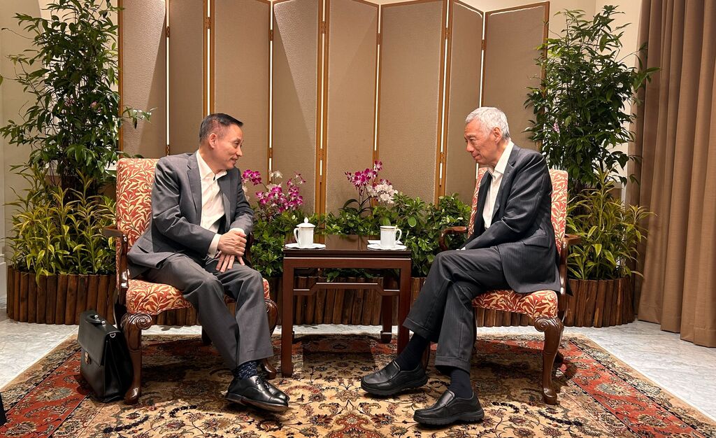 | Lê Hoài Trung (gauche) rend une visite de courtoisie à l'ancien Premier ministre et ministre d'État Lee Hsien Loong. |