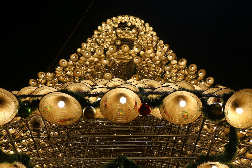 | Chaque soir, à partir de 19h00, le sapin "gigantesque", fait de plus de 3.800 chapeaux coniques vietnamiens traditionnels, s'illumine. |