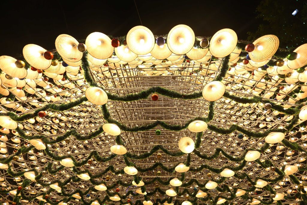 Chaque soir, à partir de 19h00, le sapin "gigantesque", fait de plus de 3.800 chapeaux coniques vietnamiens traditionnels, s'illumine. Les chapeaux sont disposés avec soin autour d’un cadre en métal pesant plusieurs tonnes, formant ainsi un sapin de Noël à quatre niveaux qui scintille de mille feux. Le sapin mesure environ 15 mètres de large au niveau inférieur, avant de se rétrécir progressivement vers le sommet. Des câbles ont également été ajoutés autour pour sécuriser l’arbre contre les intempéries.