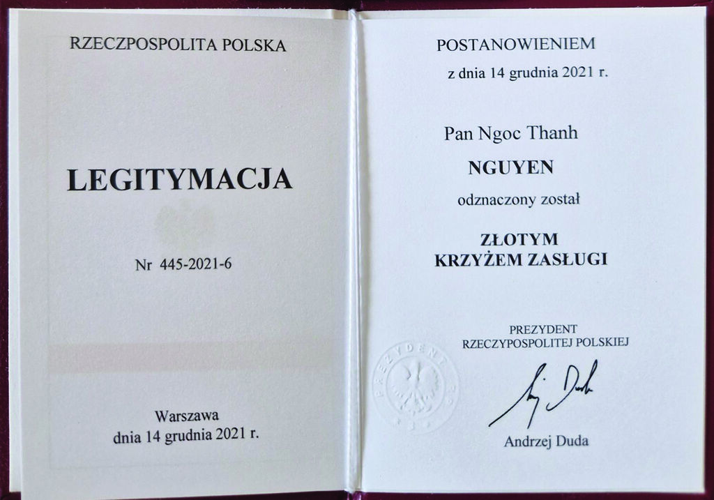 Le Pr. - Dr. Nguyên Ngoc Thành s’est vu décerner en 2021 l’Ordre du mérite de première classe par le président de la République de Pologne. C’est la plus haute récompense de l’État polonais, pour le service méritoire civil et militaire en temps de paix ou de guerre, pour la gloire et le développement de la République de Pologne.