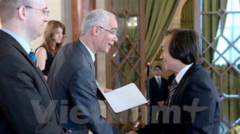 | Le docteur en mathématiques Bùi Minh Phong (droite) reçoit la confirmation de sa nomination. |