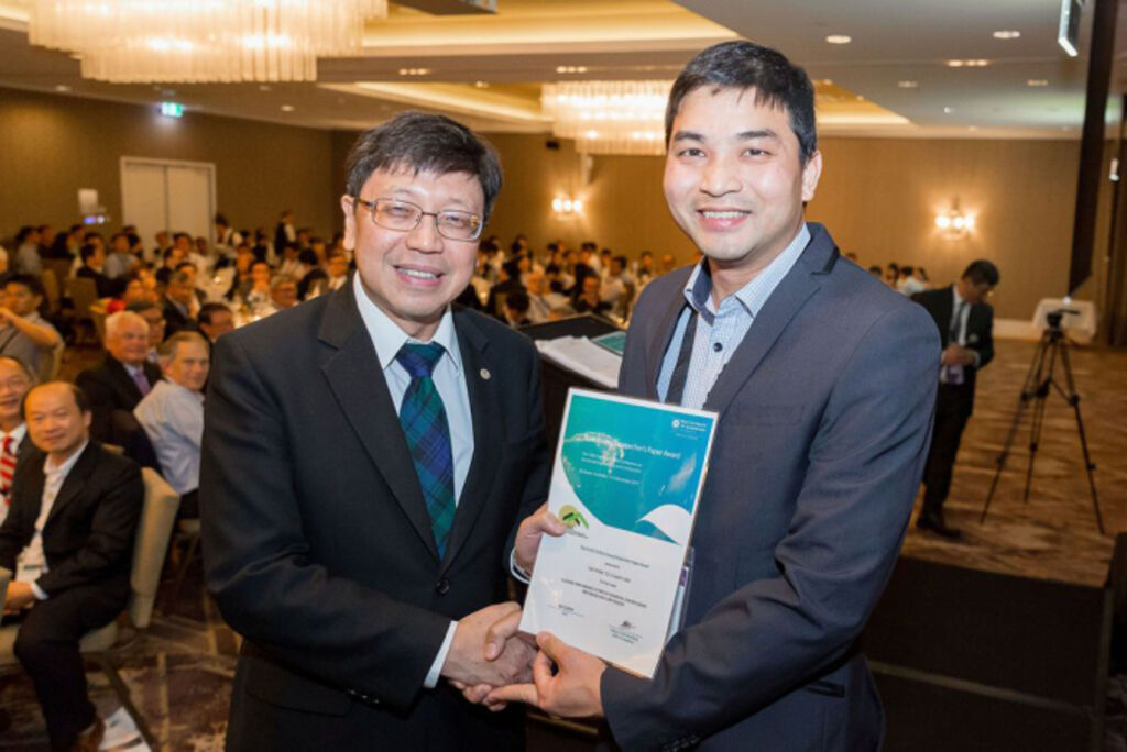 | M. Thông (droite) a reçu le prix du meilleur article lors d’une conférence internationale à Brisbane, en Australie, en 2019. Photo : NVCC/CVN |