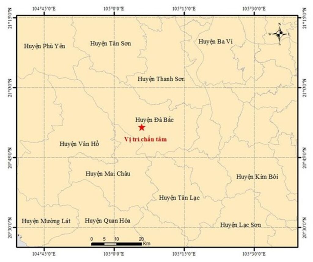 | Carte de situation du séisme de magnitude 4,0 survenu le 29 décembre dans le district de Dà Bac, à Hoa Binh. |
