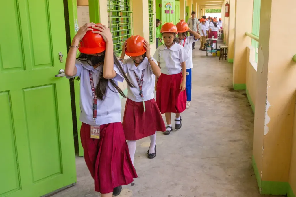 | Les séismes sont fréquents aux Philippines. Ici une classe lors d’un exercice en mars dernier. |